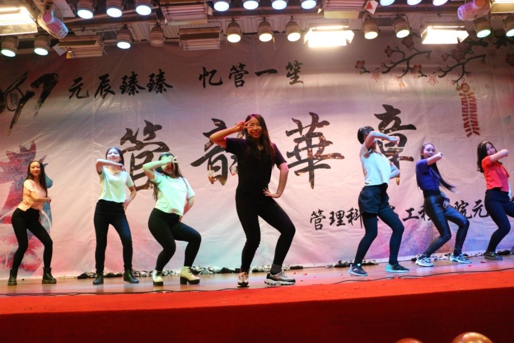 18时30分,大幕拉开。西装革履的团学骨干们用一曲《boom boompow》燃爆晚会演出现场,八仙过海各显神通,大家都拿出了自己看家的绝活,不再像平日一般不苟言笑,今天的他们在舞台上绽放出了不一样的光彩,引得场下尖叫连连。在众人的欢呼之中,穿着靓丽的五位主持人们登台亮相,共同为本场晚会带来开场词。