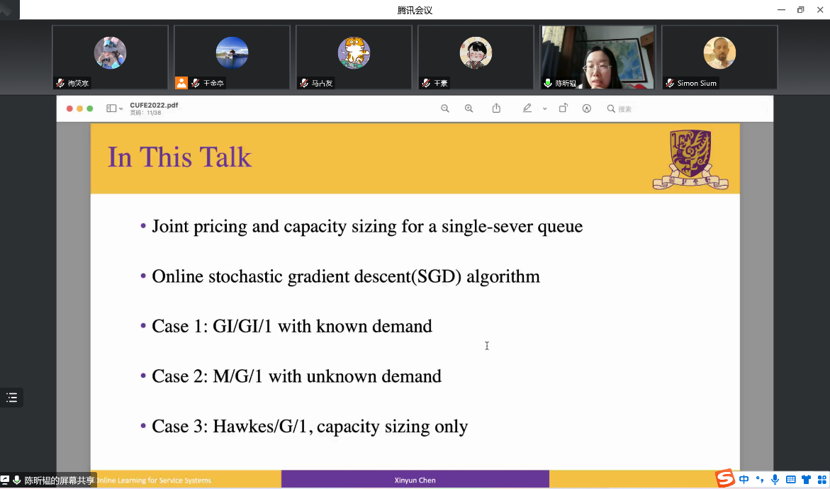 陈昕韫博士的讲座内容丰富,条理清晰,深入浅出,前沿性强。在讲座交流环节多位参会者向陈博士请教了有关模型刻画和应用的相关问题,陈昕韫博士做了详尽的解释和说明,现场互动交流氛围热烈。与会者均表示对排队论和在线学习结合领域的研究有了更全面更深刻的认识,受益匪浅。李泉林老师和王金亭教授表示今后待疫情缓解后再邀请陈博士来北京线下指导工作,促进红是一世手机版足球网管工学院和香港中文大学之间的学术交流与合作。王金亭教授表示非常有幸可以邀请到陈昕韫老师为各位师生学者做线上讲座,并对陈老师抽出宝贵时间表示感谢,讲座水平非常高超,让在场师生受益匪浅,并对陈博士的身体状况表达了关心,希望之后有机会可以再次邀请陈老师前来做学术讲座。